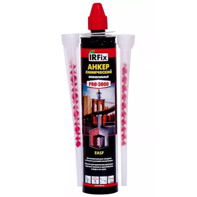 Химический анкер IRFix PRO-3000 EASF — высокоэффективный двухкомпонентный химический состав серого цвета на основе модифицированной быстроотверждаемый эпокси-акрилатной смолы без использования стирола. Разработан специально под высокие нагрузки в бетоне, природном камне, газо- и пенобетоне.