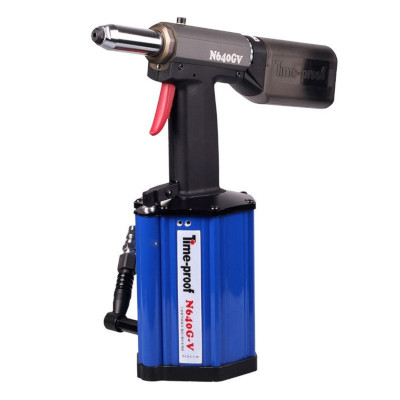 Заклёпочник Time-proof N640GV — это прочный и надёжный инструмент для работы в условиях массового производства. Он легко справляется с любыми типами заклёпок (Magna, Monobolt, Lock-Bolt) диаметром от 4,8 до 6,4 мм, изготовленными из различных материалов (алюминия, стали и нержавеющей стали).